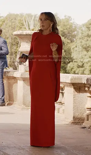 Sylvie (played by Philippine Leroy-Beaulieu) on Emily in Paris on Netflix was spotted wearing this red cape dress on Emily in Paris on episode 'La Dolce Emily' (5x01) in Dec 2025. Sylvie's Dress is the Crepe dress by Alberta Ferretti . Sylvie's Bracelet is the Peggy Cuff Gold Plated Bronze by Claire Falkenstein Co.Ro. Jewels . Sylvie's Earrings is the MAXXI Earrings by Co.Ro. Jewels . Sylvie's Shoes is the R1S502 Sandal by Francesco Russo .
