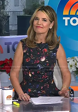 Savannah Guthrie on Today on NBC was spotted wearing this black floral sleeveless dress on Today on Dec 17 2025's episode. Savannah's Dress is the Eloise Sleeveless Midi-Dress by Adam Lippes.