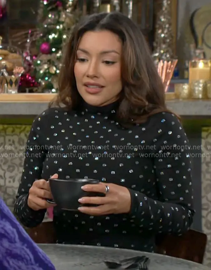 Audra Charles (played by Zuleyka Silver) on The Young and the Restless on CBS was spotted wearing this black crystal embellished top and skirt set on The Young and the Restless on Dec 17 2025's episode. Audra's Top is the Crystal Logo Turtleneck Top by Alexander Wang . Audra's Dress is the Crystal Logo Strapless Midi Dress by Alexander Wang.
