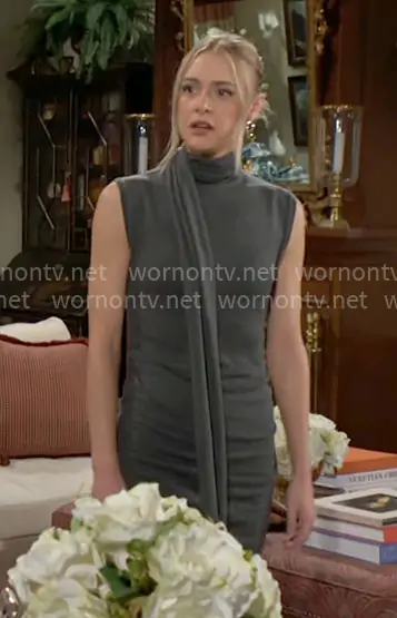 Claire Grace (played by Hayley Erin) on The Young and the Restless on CBS was spotted wearing this grey scarf-neck dress on The Young and the Restless on Dec 17 2025's episode. Claire's Dress is the Scarf-Collar Dress by H&M .