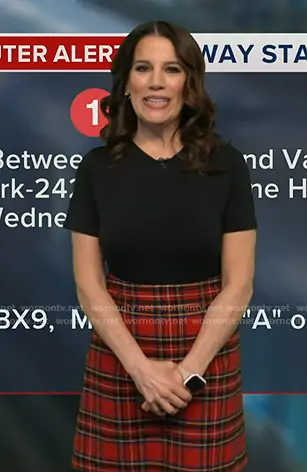 Heather O’Rourke on Good Morning America on ABC was spotted wearing this red tartan check skirt on Good Morning America on Dec 18 2025's episode. Heather's Skirt is the Plaid Wool-blend A-line Mini Skirt by J. Crew.