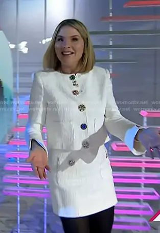 Jenna Bush Hager on Today on NBC was spotted wearing this whtie jewel button jacket and mini skirt on Today on Dec 18 2025's episode. Jenna's Jacket is the Randi Tweed Jacket by Cinq a Sept . Jenna's Skirt is the Randi Crystal Button Detail Miniskirt by Cinq a Sept.