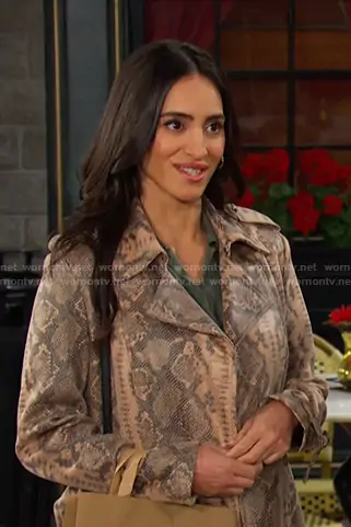 Gabi Hernandez (played by Cherie Jimenez) on Days of our Lives on Peacock was spotted wearing this beige snake print coat on Days of our Lives on Dec 18 2025's episode. Gabi's Coat is the Linda Trenchcoat by Guess.
