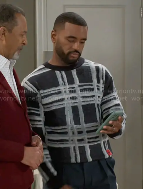 Andre Richardson (played by Sean Freeman) on Beyond the Gates on CBS was spotted wearing this checked print sweater on Beyond the Gates on Dec 18 2025's episode. Andre's Sweater is the Sekkon Graphic Sweater by Hugo.