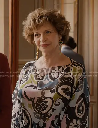 Antonia Muratori (played by Anna Galiena) on Emily in Paris on Netflix was spotted wearing this printed top on Emily in Paris on episode 'La Dolce Emily' (5x01) in Dec 2025. 's Top is the Leo Kaftan by Leonard Paris . 's Earrings is the Cascade Drop Earrings by Sylvia Toledano.