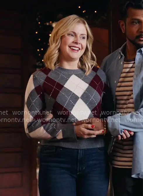 Sam (played by Rose McIver) on Ghosts on CBS was spotted wearing this argyle sweater on Ghosts on episode 'It's a Wonderful Christmas Carol' (5x09) in Dec 2025. Sam's Sweater is the Cropped argyle pattern sweater by Maje.