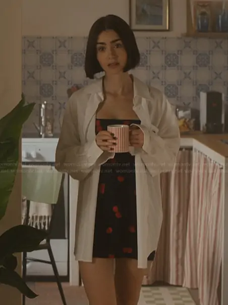 Emily Cooper (played by Lily Collins) on Emily in Paris on Netflix was spotted wearing this black cherry print mini dress on Emily in Paris on episode 'Intimissimi Issues' (5x03) in Dec 2025. Emily's Dress is the The Christy Mini Dress in Wild Cherry by Realisation Par.