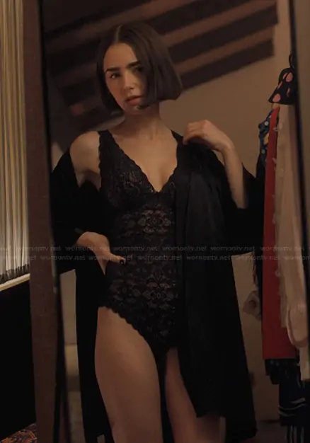 Emily Cooper (played by Lily Collins) on Emily in Paris on Netflix was spotted wearing this black lace bodysuit on Emily in Paris on episode 'Intimissimi Issues' (5x03) in Dec 2025. Emily's Bodysuit is the Eleonora Lace Bodysuit by Intimissimi . Emily's Robe is the Silk Kimono by Intimissimi.