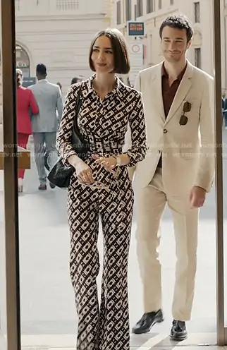 Emily Cooper (played by Lily Collins) on Emily in Paris on Netflix was spotted wearing this geometric print jumpsuit on Emily in Paris on episode 'Got to be Real' (5x02) in Dec 2025. Emily's Jumpsuit is the Michele Jumpsuit by Diane von Furstenberg . Emily's Bag is the T Timeless tote bag by Tod's . Emily's Sunglasses is the Layered Cream-acetate Sunglasses with Rose-gold-tone Temples by Boss . Emily's Bracelet is the Pompon Cuff Bracelet in Silver by Marc Deloche.