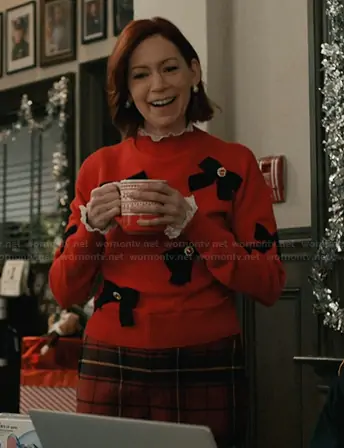 Elsbeth Tascioni (played by Carrie Preston) on Elsbeth on CBS was spotted wearing this red bow christmas sweater and pants on Elsbeth on episode 'A Hard Nut to Crack' (3x10) in Dec 2025. Elsbeth's Sweater is the Mock Neck Long Sleeve Bow Sweater by Karl Lagerfeld Paris . Elsbeth's Pants is the Plaid Cropped Pants by Lauren Ralph Lauren.