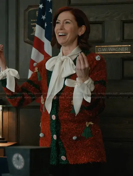 Elsbeth Tascioni (played by Carrie Preston) on Elsbeth on CBS was spotted wearing this red Christmas cardigan on Elsbeth on episode 'A Hard Nut to Crack' (3x10) in Dec 2025. Elsbeth's Sweater is the Jollidays Long Sleeve Tinsel Button Front Holiday Cardigan by Kohls.