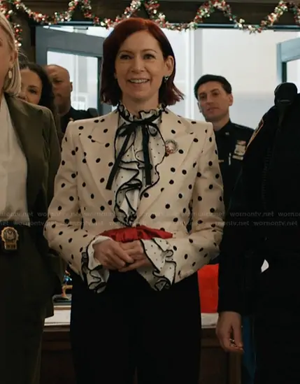 Elsbeth Tascioni (played by Carrie Preston) on Elsbeth on CBS was spotted wearing this white polka dot print blazer on Elsbeth on episode 'A Hard Nut to Crack' (3x10) in Dec 2025. Elsbeth's Top is the Harmonie Polka Dots Ruffled Shirt by Anne Fontaine . Elsbeth's Blazer is the Polka-Dot Crop Blazer With Bow by Valentino Garavani.