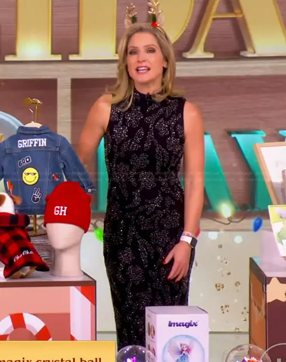 Sara Haines on The View on ABC was spotted wearing this black beaded sleeveless dress on The View on Dec 19 2025's episode. Sara's Dress is the Sylven Beaded Mock Neck Maxi Dress by Veronica Beard.