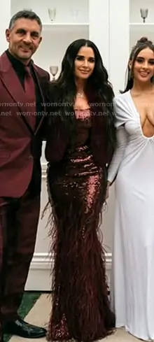 Kyle Richards on The Real Housewives of Beverly Hills on Bravo was spotted wearing this sequin feather trim gown on The Real Housewives of Beverly Hills on episode 'A Match Made in Beverly Hills' (15x03) in Dec 2025. Kyle's Dress is the Odessa Dress in Cabernet by Retrofete.