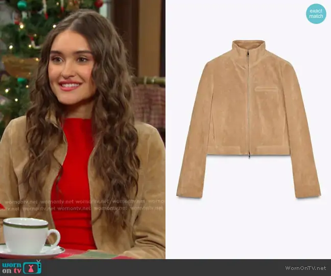 Arianna Horton (played by Marissa Reyes) on Days of our Lives on Peacock was spotted wearing this beige suede crop jacket on Days of our Lives on Dec 20 2025's episode. Ari's Jacket is the Suede Leather Jacket by Zara . Ari's Bag is the Jade Baguette Bag in black by Urban Outfitters.