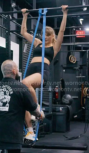 Taylor Swift on The End of an Era on Disney+ was spotted wearing this black workout outfit on The End of an Era on episode 'Kismet' (1x03) in Dec 2025. Taylor's Bra is the Energy Longline Bra in Black by Lululemon . Taylor's Shorts is the Align™ High-Rise Short in Black by Lululemon . Taylor's Shoes is the Clifton Sneaker in Donna White Blue / Blanc De Blanc Swim Day by Hoka . Taylor's Necklace is the Giovanni Necklace by Ben Amun .