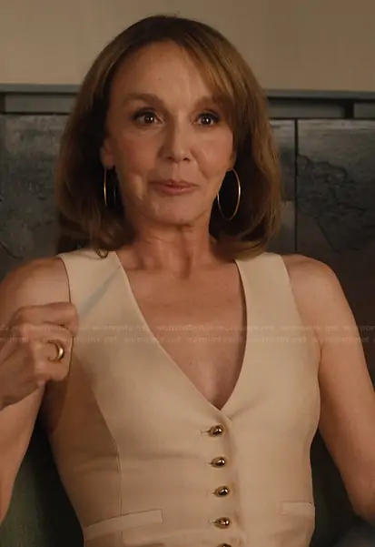 Sylvie (played by Philippine Leroy-Beaulieu) on Emily in Paris on Netflix was spotted wearing this button vest on Emily in Paris on episode 'Rome Has Fallen' (5x04) in Dec 2025. Sylvie's Vest is the Natura Waistcoat by Zimmermann.