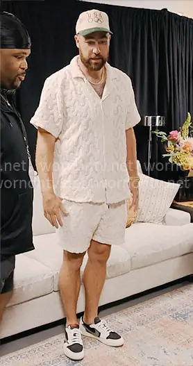 Travis Kelce on The End of an Era on Disney+ was spotted wearing this wavy crochet shirt and shorts set on The End of an Era on episode 'Thank You For The Lovely Bouquet' (1x04) in Dec 2025. 's Shirt is the Atlas Cuba Crochet Shirt by OAS . 's Shorts is the Atlas Crochet Short by OAS . 's Shoes is the Travis Scott x Air Jordan 1 Retro Low OG by Nike.