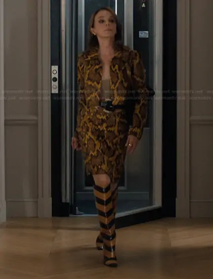 Sylvie (played by Philippine Leroy-Beaulieu) on Emily in Paris on Netflix was spotted wearing this embellished jacket and skirt on Emily in Paris on episode 'Bonjour Paris!' (5x05) in Dec 2025. Sylvie's Jacket is the Embellished tulle cropped jacket by Georges Hobeika . Sylvie's Skirt is the Embellished tulle skirt by George Hobeika . Sylvie's Shoes is the Two-tone inlaid hagfish leather boots by Fendi.