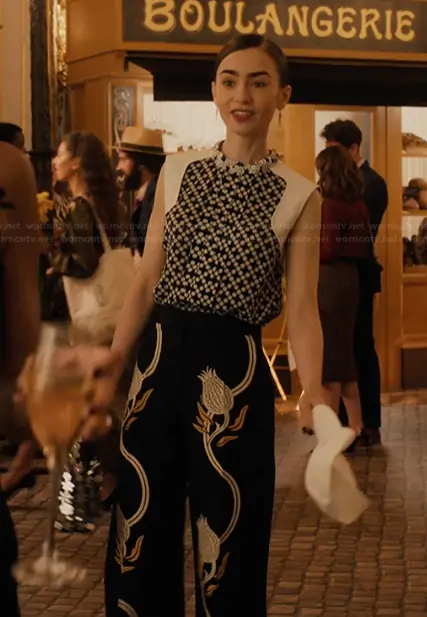 Emily Cooper (played by Lily Collins) on Emily in Paris on Netflix was spotted wearing this printed vest and floral pants on Emily in Paris on episode 'Bonjour Paris!' (5x05) in Dec 2025. Emily's Vest is the 2014 Resort Collection by Andrew Gn . Emily's Pants is the Let Loose Pants by LA DoubleJ . Emily's Coat is the Monogram Coat by Fendi . Emily's Bag is the Black Mirror Mia Bag by L'Alingi.