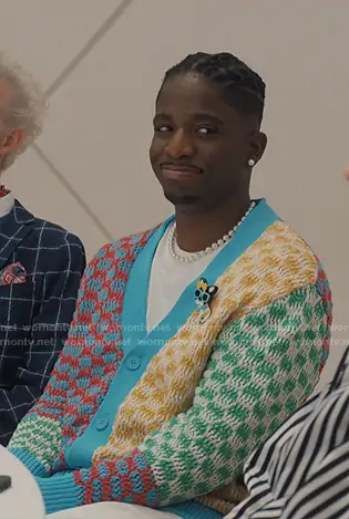 Julien (played by Samuel Arnold) on Emily in Paris on Netflix was spotted wearing this multicolor check knit cardigan on Emily in Paris on episode 'The One Where Emily Goes to the Embassy' (5x06) in Dec 2025. Julien's Sweater is the Colorful Jacquard Cardigan by Zara.