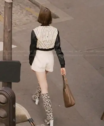 Emily Cooper (played by Lily Collins) on Emily in Paris on Netflix was spotted wearing this floral boots and leather bag on Emily in Paris on episode 'Bonjour Paris!' (5x05) in Dec 2025. Emily's Shoes is the Cloth Boots by Max Mara . Emily's Bag is the Le 5 A 7 Large Shoulder Hobo Bag in Smooth Leather by Saint Laurent.