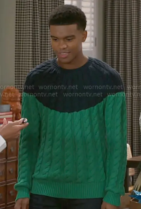 Tyrell Richardson (played by Jaden Lucas Miller) on Beyond the Gates on CBS was spotted wearing this green cable knit sweater on Beyond the Gates on Dec 22 2025's episode. Tyrell's Sweater is the Supima® Cotton Cable Contrast-Yoke Sweater by Brooks Brothers.