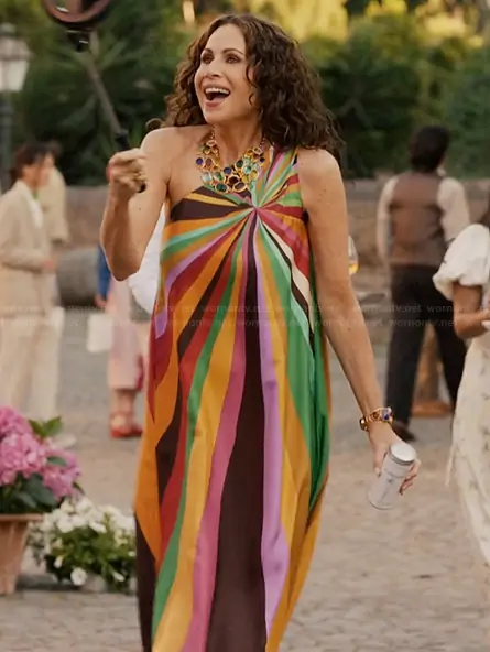 Princess Jane (played by Minnie Driver) on Emily in Paris on Netflix was spotted wearing this rainbow stripe one shoulder dress on Emily in Paris on episode 'Rome Has Fallen' (5x04) in Dec 2025. 's Dress is the Roy one-shoulder silk maxi dress by LA DoubleJ.