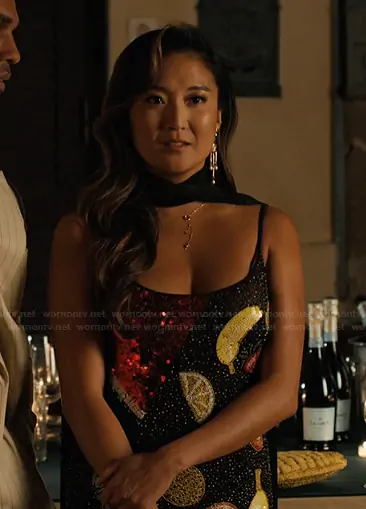 Mindy Chen (played by Ashley Park) on Emily in Paris on Netflix was spotted wearing this fruit sequin mini dress on Emily in Paris on episode 'Rome Has Fallen' (5x04) in Dec 2025. Mindy's Dress is the Bead embellished stretch-tulle mini dress by Leslie Amon . Mindy's Earrings is the Moon Face Pearl Drop Stud Earrings by Ottoman Hands.
