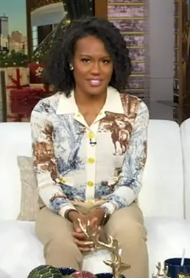 Janai Norman on Good Morning America on ABC was spotted wearing this print cardigan on Good Morning America on Dec 22 2025's episode. Janai's Sweater is the Osiris Jacquard Collared Cardigan in Tan Mt Western Toile by L'Agence.