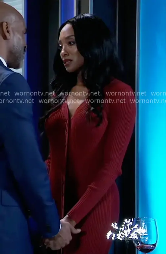 Jordan Ashford (played by Tanisha Mariko Harper) on General Hospital on ABC was spotted wearing this burgundy rib knit maxi dress on General Hospital on Dec 22 2025's episode. Jordan's Dress is the Shoko Rib-Knit Button-Front Maxi Dress in Crimson by Staud .