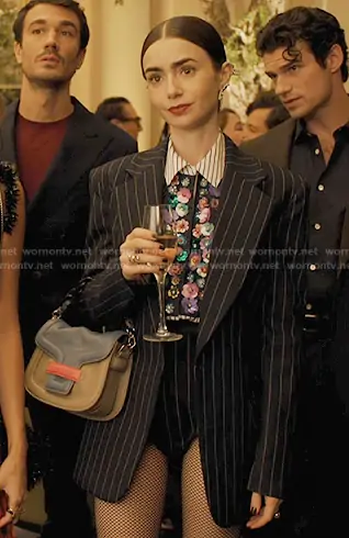 Emily Cooper (played by Lily Collins) on Emily in Paris on Netflix was spotted wearing this floral embellished shirt on Emily in Paris on episode 'Fashion Statement' (5x08) in Dec 2025. Emily's Top is the Cotton Shirt with Eequin and Bead Placket by Essentiel Antwerp . Emily's Bag is the Mini Alpha Ville Shoulder Bag by Pierre Hardy . Emily's Shoes is the Leather Patchwork Studded Knee-High Boots by Valentino Garavani.