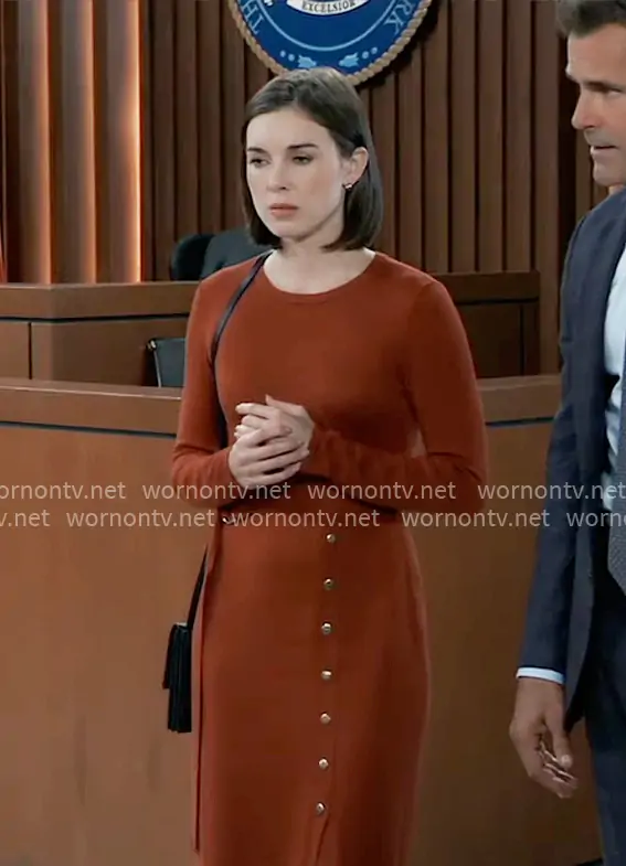 Willow Tait (played by Katelyn MacMullen) on General Hospital on ABC was spotted wearing this orange long sleeved dress on General Hospital on Dec 23 2025's episode. Willow's Dress is the Long Sleeve Belted Midi Dress by Jessica Howard .