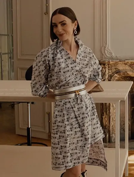 Emily Cooper (played by Lily Collins) on Emily in Paris on Netflix was spotted wearing this printed dress on Emily in Paris on episode 'La Belle Époque' (5x09) in Dec 2025. Emily's Dress is the Safety Pin Print Dress by Vivienne Westwood . Emily's Belt is the Leather Belt by Barbara Bui . Emily's Shoes is the Blake 85 two-tone leather wedge knee boots by Jimmy Choo . Emily's Bag is the Leather Voltaire Top-Handle Bag by Saint Laurent.