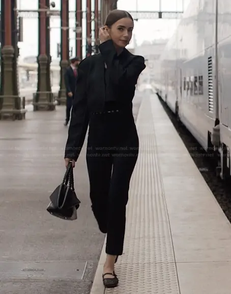 Emily Cooper (played by Lily Collins) on Emily in Paris on Netflix was spotted wearing this black ballet flats on Emily in Paris on episode 'La Belle Époque' (5x09) in Dec 2025. Emily's Shoes is the Woven leather Mary Jane ballet flats by Le Monde Beryl.