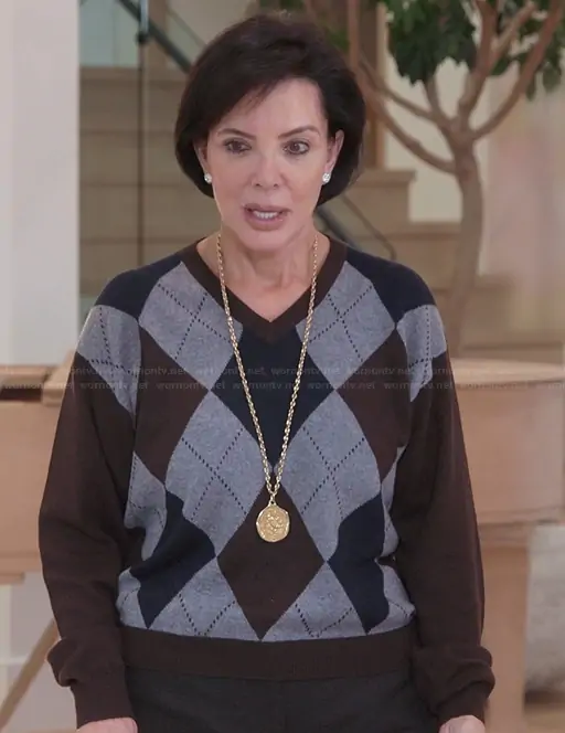 Kris Jenner (played by Kris Jenner) on The Kardashians on Hulu was spotted wearing this argyle sweater on The Kardashians on episode 'So Breaking News…' (7x10) in Dec 2025. Kris's Sweater is the Cashmere V-neck sweater by Prada.