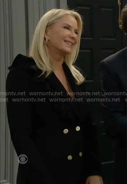 Brooke Logan (played by Katherine Kelly Lang) on The Bold and the Beautiful on CBS was spotted wearing this black ruffled blazer dress on The Bold and the Beautiful on Dec 26 2025's episode. Brooke's Dress is the Latoya Dress by Alice + Olivia.