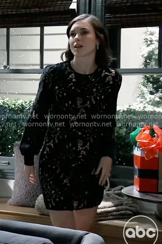 Willow Tait (played by Katelyn MacMullen) on General Hospital on ABC was spotted wearing this black lace dress on General Hospital on Dec 28 2025's episode. Willow's Dress is the Palm Lace Blouson Sleeve Dress by MICHAEL Michael Kors .
