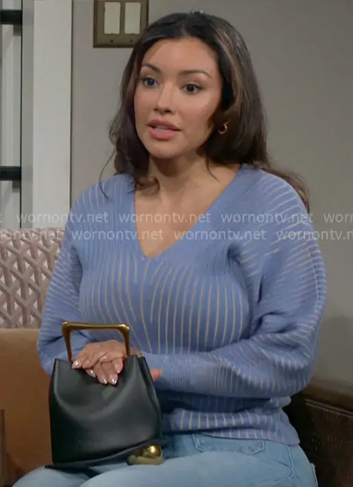 Audra Charles (played by Zuleyka Silver) on The Young and the Restless on CBS was spotted wearing this blue ribbed v-neck sweater on The Young and the Restless on Dec 29 2025's episode. Audra's Sweater is the V-neck ribbed jumper by DKNY . Audra's Jeans is the The Hustler Patch Pocket Ankle Bootcut Jeans in Tune In Tune Out by Mother . Audra's Bag is the Borderline Daily Bag by Zadig & Voltaire . Audra's Bag is the Vienna Handbag in Black by Verano Hill .