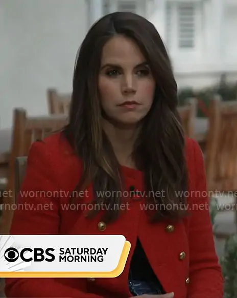 on CBS Mornings on CBS was spotted wearing this red jacket with gold buttons on CBS Mornings on Dec 27 2025's episode. 's Jacket is the Bentley Jacket in Nantucket Red by Veronica Beard .