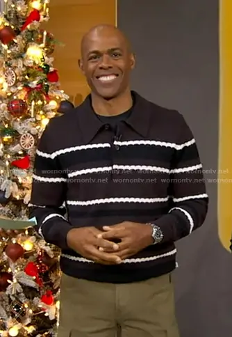 on Good Morning America on ABC was spotted wearing this brown striped polo sweater on Good Morning America on Dec 30 2025's episode. 's Sweater is the Alfie 60019 Stripe Polo Sweater in Dusky Port by NN07.