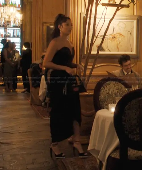 Mindy Chen (played by Ashley Park) on Emily in Paris on Netflix was spotted wearing this black sweetheart dress on Emily in Paris on episode 'Bonjour Paris!' (5x05) in Dec 2025. Mindy's Dress is the Balykina Carry dress in black by Cult Mia . Mindy's Bag is the Le Baiser by Ozias . Mindy's Shoes is the Viv Choc Strass Platform Sandals in Satin by Roger Vivier.