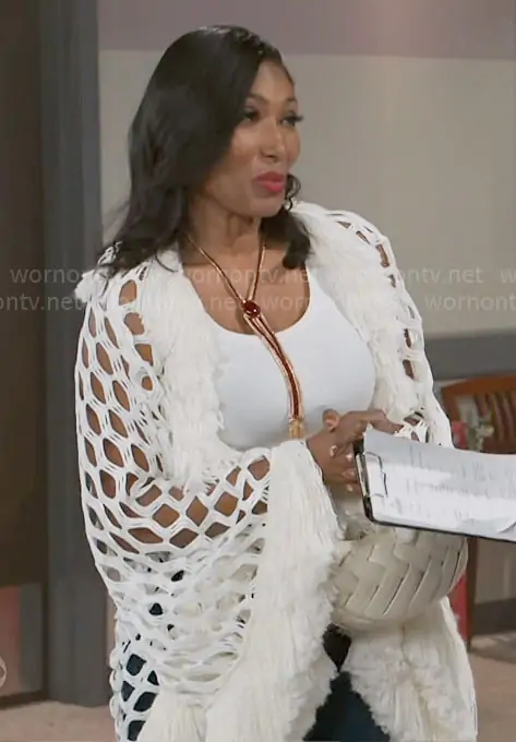 Dana 'Leslie' Thomas (played by Trisha Mann-Grant) on Beyond the Gates on CBS was spotted wearing this white crochet cardigan with fringed trims on Beyond the Gates on Dec 30 2025's episode. Leslie's Sweater is the Born Like This Fringe Detail Long Cardigan by Akira . Leslie's Necklace is the Gold Burgundy Western Boho Tassel Necklace by Lovisa . Leslie's Bag is the Orla Weave Handbag by JW Pei.