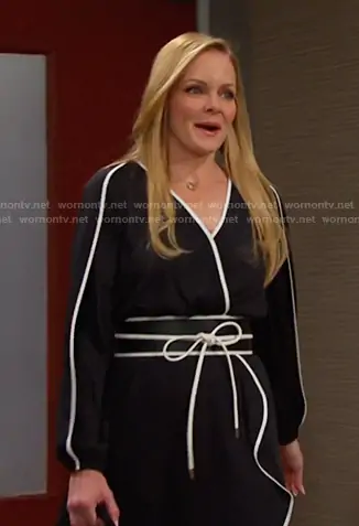 Belle Brady (played by Martha Madison) on Days of our Lives on Peacock was spotted wearing this black contrast trim dress and belt on Days of our Lives on Dec 31 2025's episode. Belle's Dress is the Contrast Ruffle Midi Dress by White House Black Market . Belle's Belt is the Contrast Obi Belt by White House Black Market.