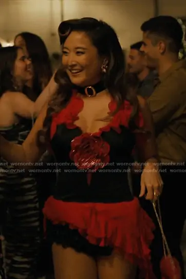 Mindy Chen (played by Ashley Park) on Emily in Paris on Netflix was spotted wearing this black floral applique corset top on Emily in Paris on episode 'Got to be Real' (5x02) in Dec 2025. Mindy's Top is the Floral-appliqué Bustier Top by Parlor . Mindy's Top is the Joya Top in Rouge by Mirae . Mindy's Bag is the Lip Clutch in Lucky Red by Simon Miller . Mindy's Shoes is the Pamela Boots by Cazabat .