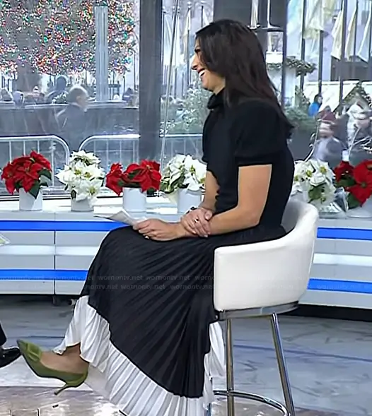 Dr. Natalie Azar on Today on NBC was spotted wearing this black short sleeve top and skirt on Today on Jan 01 2026's episode. Natalie A's Top is the Chase Puff-Sleeve Ruffle-Neck Sweater by Alice + Olivia . Natalie A's Skirt is the Katz Two-tone Pleated Satin Midi Skirt by Alice + Olivia . Natalie A's Shoes is the Maysale 70 buckle-embellished suede-trimmed woven raffia pumps by Manolo Blahnik.