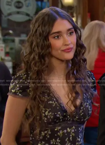 Arianna Horton (played by Marissa Reyes) on Days of our Lives on Peacock was spotted wearing this black floral lace trim dress on Days of our Lives on Jan 06 2026's episode. 's Dress is the Cora Lace Trim Asymmetrical Midi Dress by Kimchi Blue.
