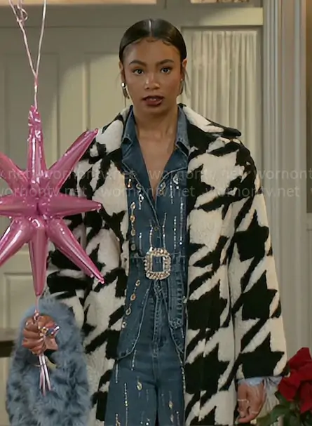 Chelsea Hamilton (played by RhonniRose Mantilla) on Beyond the Gates on CBS was spotted wearing this black and white coat with embellished denim jacket on Beyond the Gates on Jan 01 2026's episode. Chelsea's Coat is the Arlo Coat by L'Academie . Chelsea's Bag is the Alix Faux Fur Bag by LaMarque.