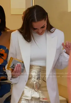Meredith Marks on The Real Housewives of Salt Lake City on Bravo was spotted wearing this metallic mini skirt on The Real Housewives of Salt Lake City on episode 'Opas and Outbursts' (6x15) in Dec 2025. Meredith's Skirt is the Cherry Faux-Leather Miniskirt in Champagne by Aknvas.