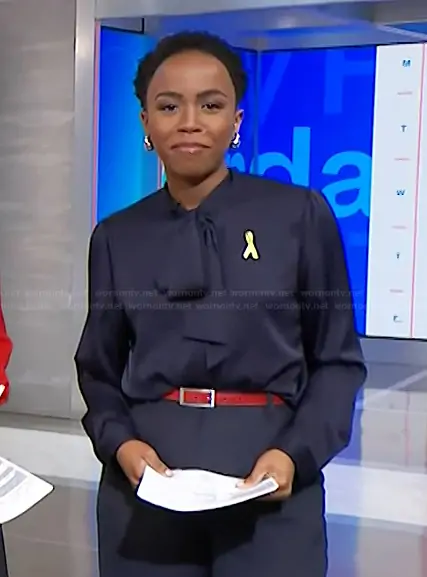 Zinhle Essamuah on NBC News Daily on NBC was spotted wearing this navy tie neck blouse on NBC News Daily on Mar 02 2026's episode. Zinhle's Top is the Washable Stretch Silk Tie Neck Blouse in Navy by Quince.